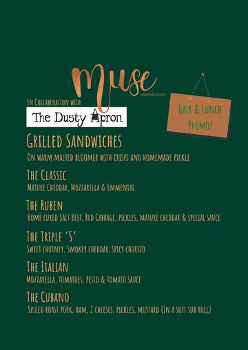 If you are with us over lunchtime or enjoying one of our longer packages then take advantage of our collaboration with our local Winchester Street Bakery, The Dusty Apron. Available Tuesday to Saturday. Please add in your appointment notes your menu choice.